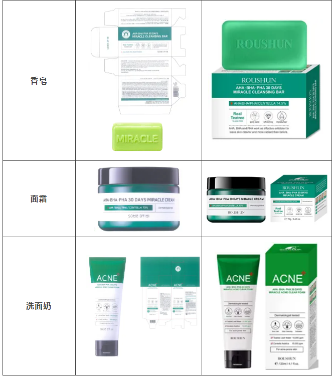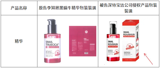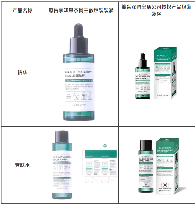 2021年原告委托球友会调查发现,被告汕头市深特宝洁实业有限公司生产、销售和推广的“茶树祛痘美白补水液”“茶树香皂”等护肤品,其产品包装装潢直接抄袭、摹仿原告前述已经具有较高知名度和影响力的“SOME BY MI/莎柏蜜”茶树三酸系列化妆品和黑蜗牛精华液的包装、装潢设计,使用与之近似的标识,造成消费者混淆误认。故原告作为茶树三酸、黑蜗牛精华包装装潢权益获益人,诉至广东省汕头市中级人民法院。汕头中院认定:李知恩主张的茶树三酸、黑蜗牛精华包装装潢构成具有一定影响的包装装潢,深特宝洁公司生产、销售茶树三酸、黑蜗牛精华液的行为构成不正当竞争。因判赔额不符合原告预期,原告后上诉至广东省高级人民法院,广东省高级人民法院最终维持一审判决。