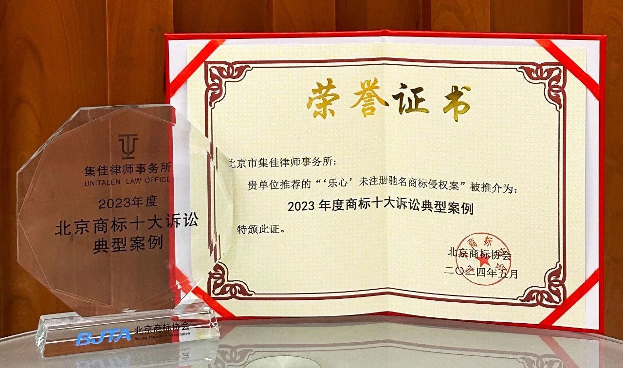 >球友会>关于我们>荣誉概览>2024>集佳代理2个案例入选北京商标协会2023年度商标十大诉讼与非诉典型案例